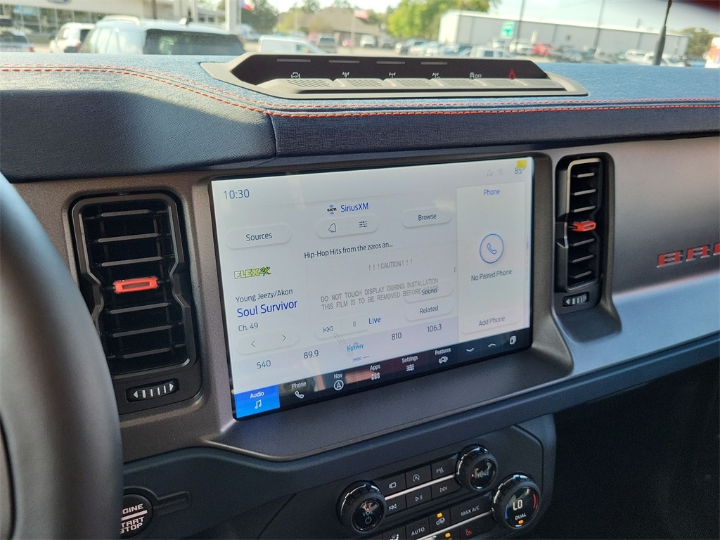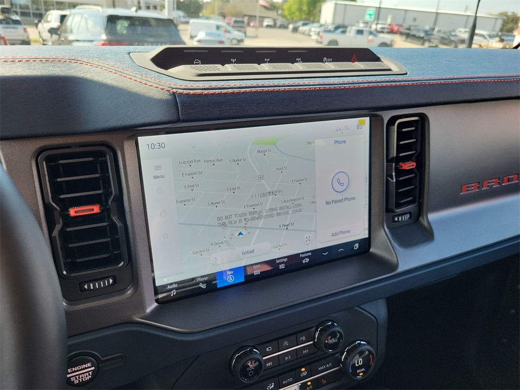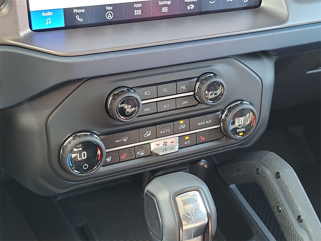 This 2025 Ford Bronco Raptor in Shadow Black comes with the following features: 3.0L EcoBoost V6 10-Speed Automatic 4WD Bronco Raptor, Shadow Black, and Blue w/Black Onyx w/Leather-Trimmed/Vinyl Bucket Seats or Leather-Trimmed/Vinyl Bucket Seats w/Blue/Black Bronco Raptor, Shadow Black, Blue w/Black Onyx w/Leather-Trimmed/Vinyl Bucket Seats or Leather-Trimmed/Vinyl Bucket Seats w/Blue/Black, 12 Speakers, 4-Wheel Disc Brakes, ABS brakes, Air Conditioning, Alloy wheels, AM/FM radio: SiriusXM with 360L, Auto High-beam Headlights, Auto-dimming Rear-View mirror, Automatic temperature control, Brake assist, Compass, Connected Navigation, Convertible HardTop, Convertible roof lining, Delay-off headlights, Driver door bin, Driver vanity mirror, Dual front impact airbags, Dual front side impact airbags, Electronic Stability Control, Emergency communication system: 911 Assist, Exterior Parking Camera Rear, Front anti-roll bar, Front Bucket Seats, Front Center Armrest, Front dual zone A/C, Front fog lights, Front reading lights, Front wheel independent suspension, Fully automatic headlights, Garage door transmitter, Glass rear window, Heated door mirrors, Heated front seats, Heated steering wheel, Illuminated entry, Integrated roll-over protection, Leather Shift Knob, Low tire pressure warning, Marine Grade Vinyl Bucket Seats, Navigation system: Connected Navigation, Occupant sensing airbag, Outside temperature display, Overhead airbag, Overhead console, Panic alarm, Passenger door bin, Passenger vanity mirror, Power door mirrors, Power steering, Power windows, Radio data system, Radio: B&O Sound System by Bang & Olufsen, Rear anti-roll bar, Rear seat center armrest, Rear window defroster, Rear window wiper, Remote keyless entry, Security system, SiriusXM w/360L, Speed control, Split folding rear seat, Steering wheel mounted audio controls, SYNC 4, Tachometer, Telescoping steering wheel, Tilt steering wheel, Traction control, Trip computer, Turn signal indicator mirrors, Variably intermittent wipers, Voltmeter, and Wheels: 17" Black High Gloss-Painted Aluminum.