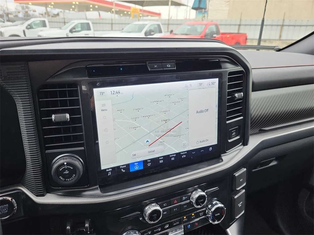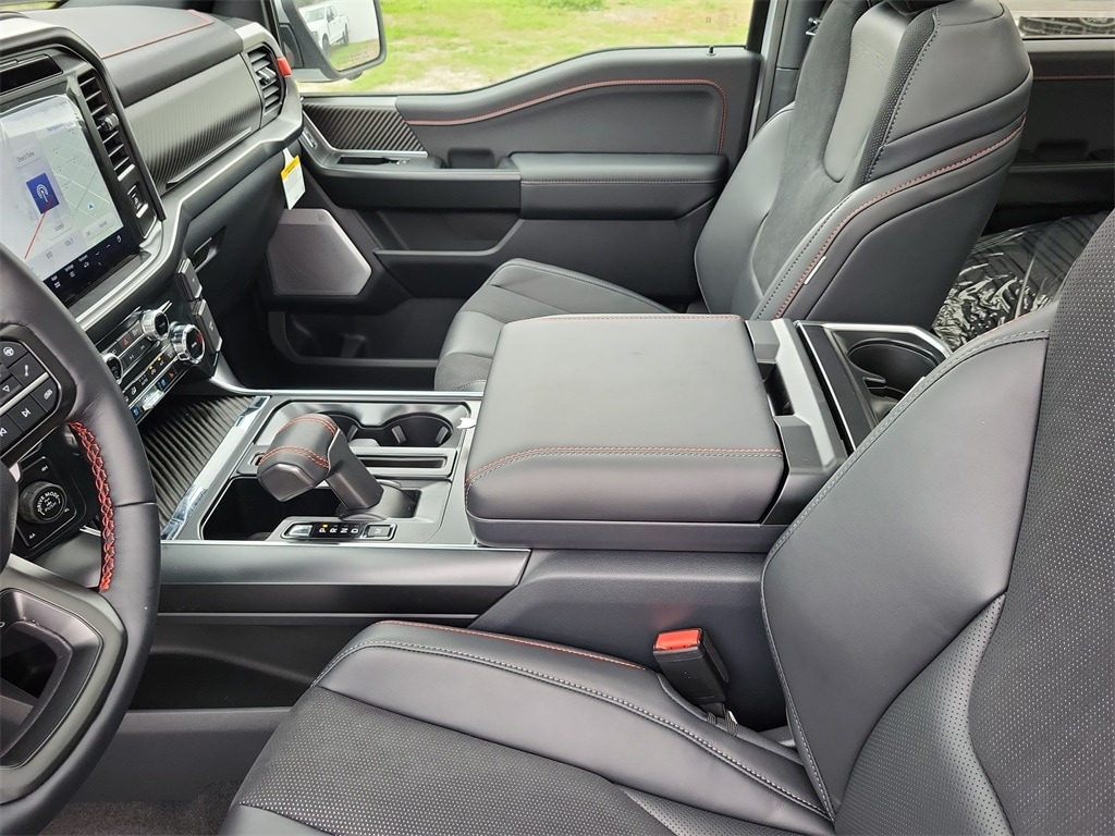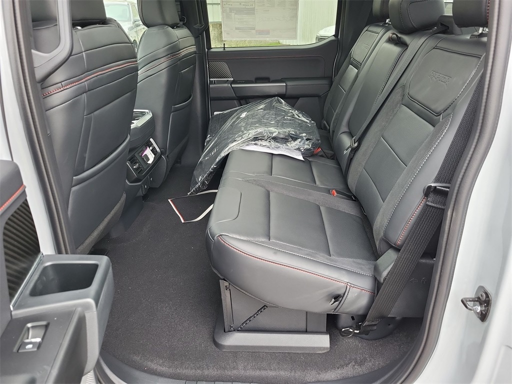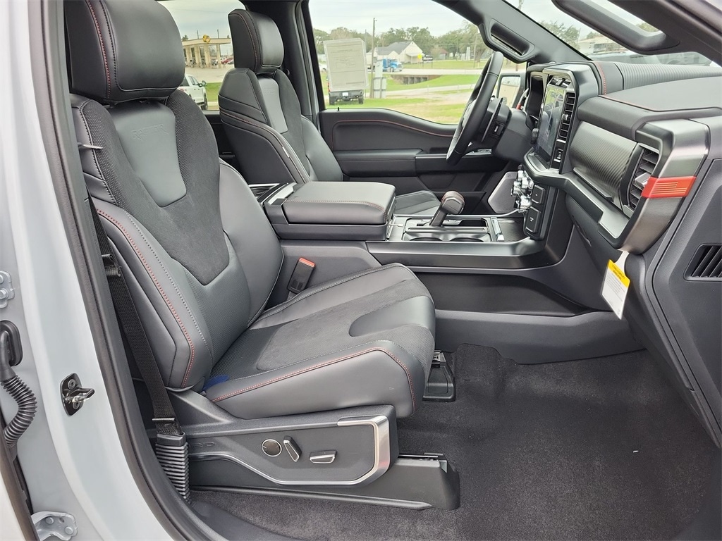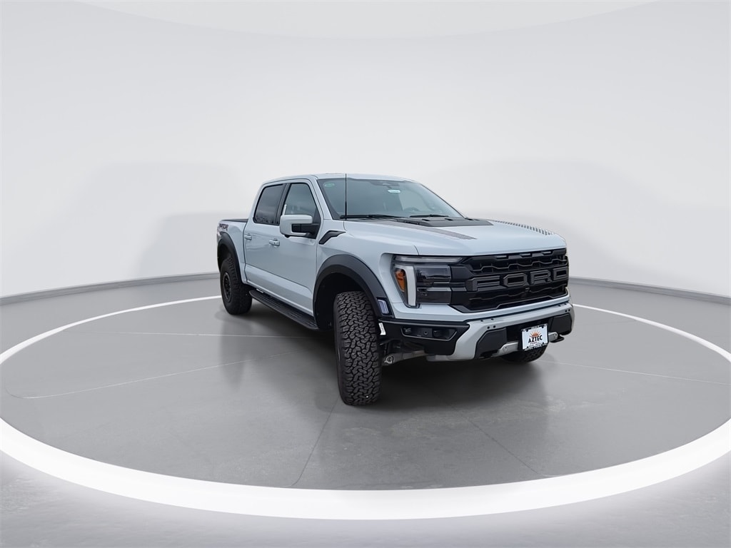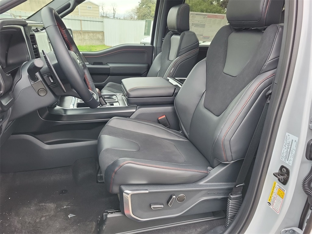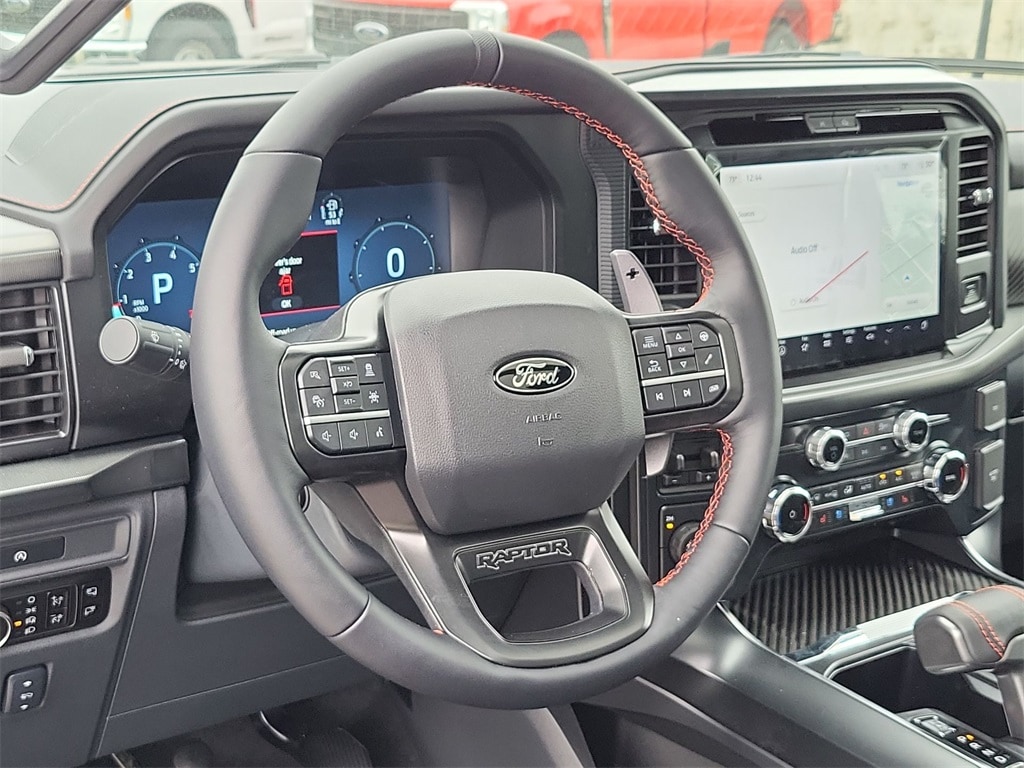 This 2025 Ford F-150 Raptor in Space White Metallic comes with the following features: 3.5L V6 EcoBoost 10-Speed Automatic 4WD 4WD 4WD, 14 Speakers, 17" Cast Aluminum Wheels, 4-Wheel Disc Brakes, ABS brakes, Adjustable pedals, Air Conditioning, Alloy wheels, AM/FM radio: SiriusXM with 360L, Auto High-beam Headlights, Auto tilt-away steering wheel, Auto-dimming door mirrors, Auto-dimming Rear-View mirror, Automatic temperature control, Brake assist, Bumpers: body-color, Compass, Delay-off headlights, Driver door bin, Driver vanity mirror, Dual front impact airbags, Dual front side impact airbags, Electronic Locking w/4.10 Axle Ratio, Electronic Stability Control, Emergency communication system: SYNC 4 911 Assist, Front anti-roll bar, Front Bucket Seats, Front Center Armrest, Front dual zone A/C, Front fog lights, Front reading lights, Front wheel independent suspension, Fully automatic headlights, Garage door transmitter, Heads-Up Display, Heated door mirrors, Heated front seats, Heated rear seats, Heated steering wheel, Illuminated entry, Internet access capable: FordPass Connect 5G, Lane Departure Warning System, Leather steering wheel, Leather Trimmed Seats, Low tire pressure warning, Memory seat, Navigation system: Connected Navigation, Occupant sensing airbag, Outside temperature display, Overhead airbag, Overhead console, Panic alarm, Passenger door bin, Passenger vanity mirror, Pedal memory, Power door mirrors, Power driver seat, Power passenger seat, Power steering, Power windows, Radio data system, Radio: B&O Unleashed Sound System by Bang & Olufsen, Rain sensing wipers, Rear reading lights, Rear step bumper, Rear window defroster, Remote keyless entry, Security system, Speed control, Speed-sensing steering, Split folding rear seat, Steering wheel memory, Steering wheel mounted audio controls, SYNC 4 w/Enhanced Voice Recognition, Tachometer, Telescoping steering wheel, Tilt steering wheel, Traction control, Trip computer, Turn signal indicator mirrors, Variably intermittent wipers, and Ventilated front seats.